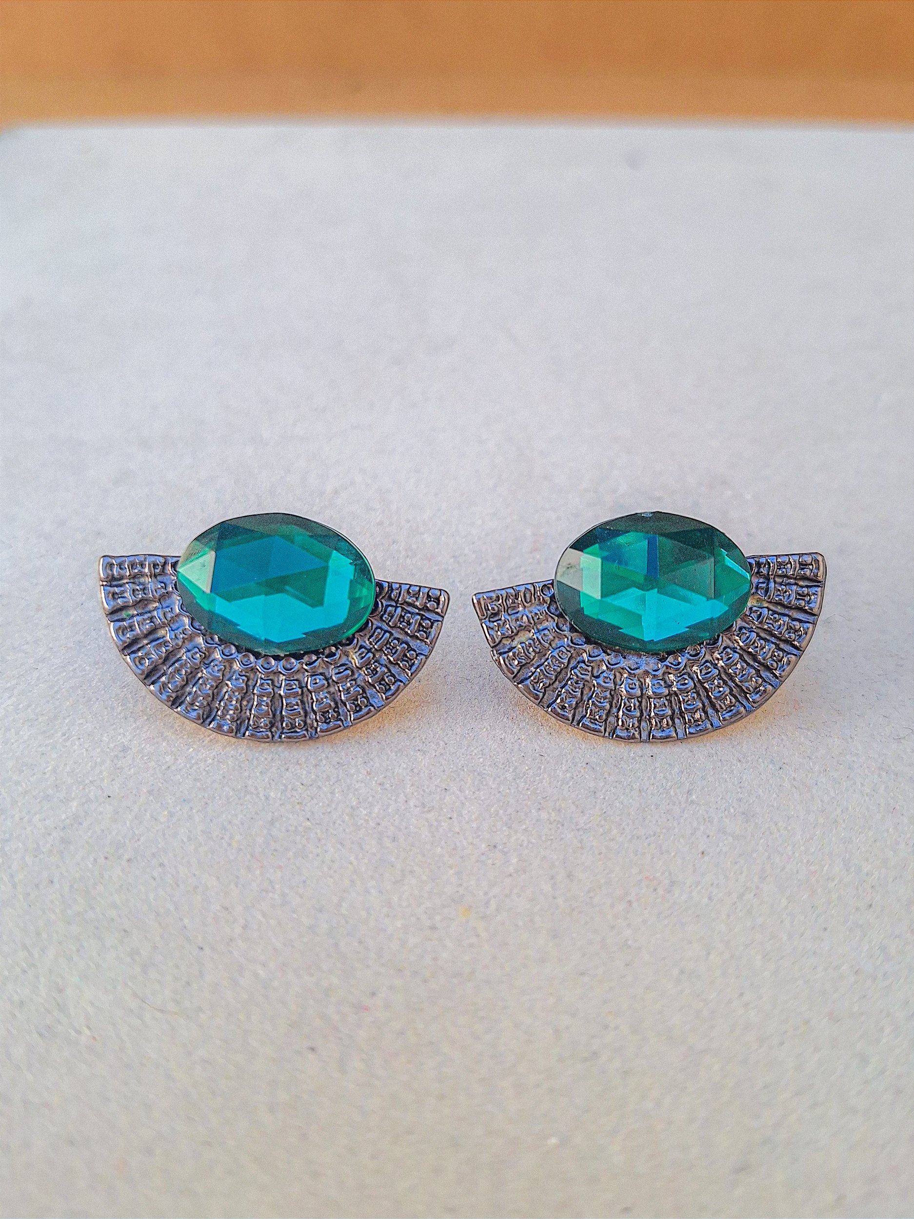 Materiais: metal grafite; cabochon plástico verde cristalizado.